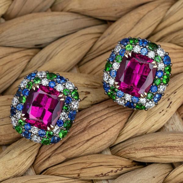 The 12ctw Cushion Cut Fuchsia Sapphire Halo Stud Earrings from Sayabling are a captivating blend of bold color and timeless elegance. Crafted from high-quality 925 sterling silver, these earrings feature vibrant fuchsia pink sapphires in a cushion cut, surrounded by a halo of sparkling white stones.