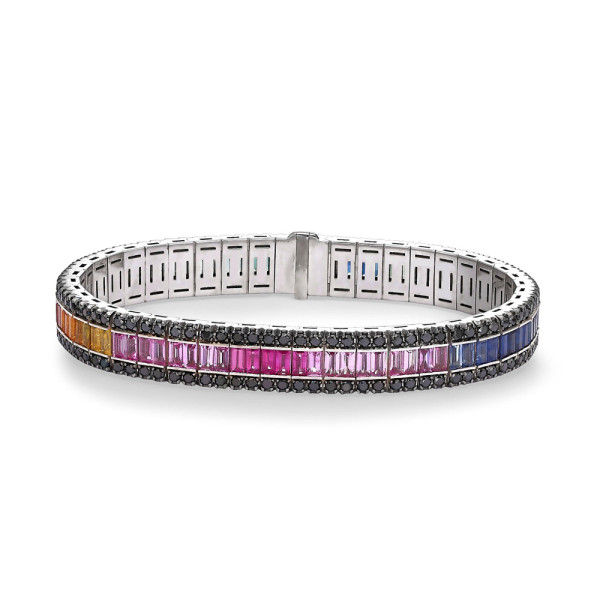 Illuminate your style with the 14 ctw Baguette-Cut Multicolor Sapphire Rainbow Bracelet. Featuring vivid baguette-cut multicolor sapphires in a vibrant spectrum of colors, this bracelet is beautifully set in 925 sterling silver. Perfect for stacking or wearing solo, it’s a celebration of color and craftsmanship.