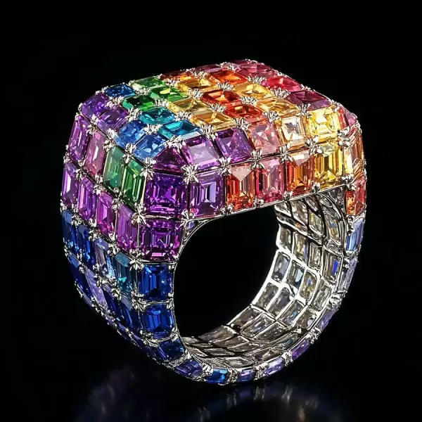 The SayaBling 20ctw Allover Asscher Cut Multicolor Sapphire Bold Rainbow Cocktail Ring is a vibrant statement piece designed for those who appreciate bold, colorful jewelry. Crafted from 925 sterling silver, this ring features a total of 20 carats of multicolor Asscher-cut sapphires, offering a dazzling array of hues. Its substantial design makes it ideal for special occasions or as a standout accessory in everyday wear.