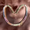 A necklace that is perfect if you want to add some color to your outfit. princess cut rainbow colored gems attached together makes up this beautiful necklace that looks great on. A strong clasp and so lightweight you hardly know it's on. I wore mine today as soon as it got here. It didn't turn brassy or leave marks around my neck, it stayed bright and shiny everything through the salty sweat.