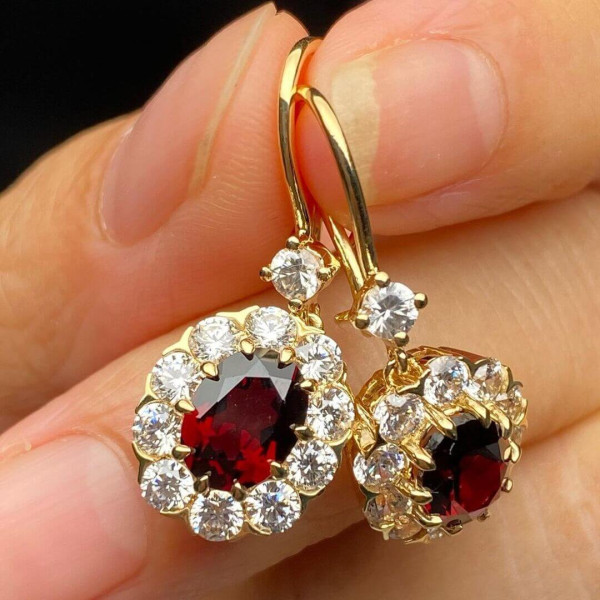 SayaBling's 2.5ct Oval Cut Garnet/Amethyst Drop Earrings in Gold are a captivating blend of elegance and vibrant color. Crafted from 925 sterling silver with a gold finish, these earrings feature a 2.5-carat oval-cut amethyst gemstone, complemented by sparkling sapphires that enhance their allure. The drop design adds a touch of sophistication, making them suitable for both everyday wear and special occasions.