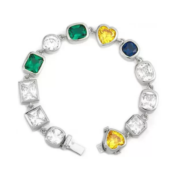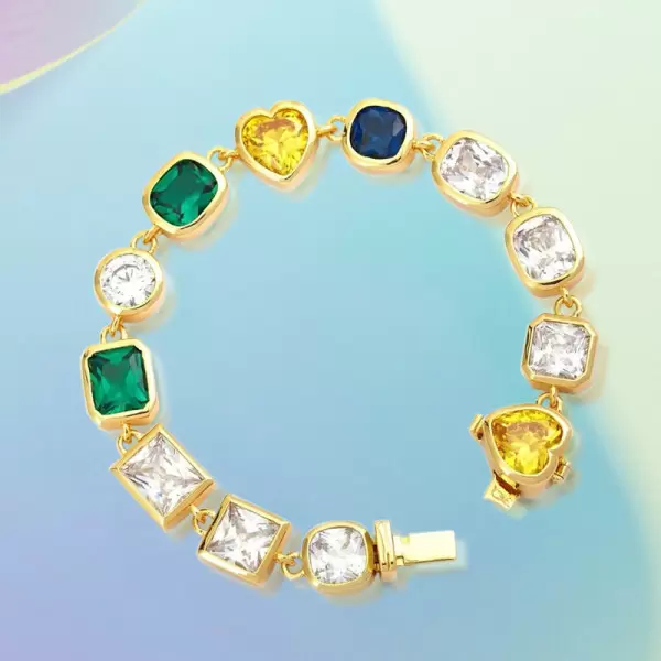 Make a vibrant statement with this 30 ctw Multi-Cut Multicolor Sapphire Statement Bracelet. Featuring an array of sapphires in varied cuts and hues—perfectly set in gold-plated, 925 sterling silver—this dazzling bracelet brings colorful elegance to any wrist. Customizable with yellow gold, rose gold, or silver plating, and available in multiple lengths for a tailored fit.
