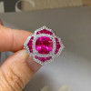 Express your love with SayaBling's 3 ct Cushion-Cut Ruby Rose Engagement Ring. This romantic ring showcases a vibrant 3 ct cushion-cut ruby at its center, encircled by a delicate rose-inspired halo of white sapphires. The platinum-plated, nickel-free 925 sterling silver band offers enduring beauty and hypoallergenic wear.