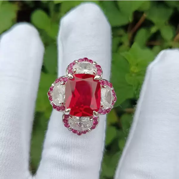 A striking 6 ct cushion-cut ruby flower cocktail ring, crafted in 925 sterling silver. The bold cushion-cut ruby center exudes rich, passionate red tones, complemented by a sleek modern band design that lets the gemstone take centre stage. Perfect for proposals, anniversaries, or as a standout symbol of love and devotion.
