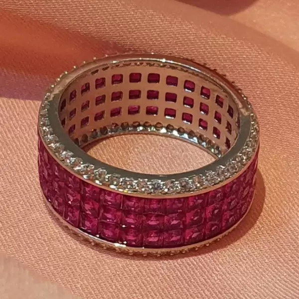 SayaBling's 8.5ctw Princess Cut Three Row Wedding Band is a vibrant and sophisticated piece that showcases a harmonious blend of emerald, ruby, and sapphire gemstones. Crafted from 925 sterling silver, this ring features three rows of princess-cut stones totaling 8.5 carats, offering a bold and colorful statement suitable for weddings, anniversaries, or as a standout accessory.