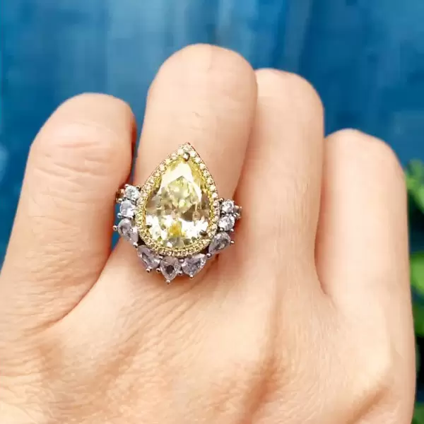 Infused with regal charm, this Pear‑Cut Crown Yellow Sapphire Engagement Ring showcases a radiant, pear-shaped yellow sapphire held in a bold crown-style setting. Set in 925 sterling silver, the vibrant canary-like hue and secure design create a vintage-inspired silhouette that blends drama with everyday elegance. Ideal for an expressive and luminous symbol of commitment.