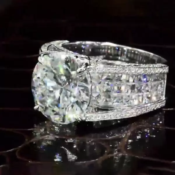 This engagement ring features a round brilliant cut center stone, complemented on either side by micro-pave setting round diamond accents for a spectacular look. Perfectly for your wedding, engagement, and your proposal ring.