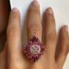 Dazzle with SayaBling's 4 ct Cushion‑Cut Pink Sapphire & Ruby Cluster Vintage Cocktail Ring. Expertly crafted in rose gold plated 925 sterling silver, this heirloom‑inspired piece features a cushion-cut pink sapphire (8×10 mm) surrounded by a halo and outer cluster of vivid rubies, offering a total color-rich gemstone weight of approximately 12 ctw. Vintage charm meets bold elegance.
